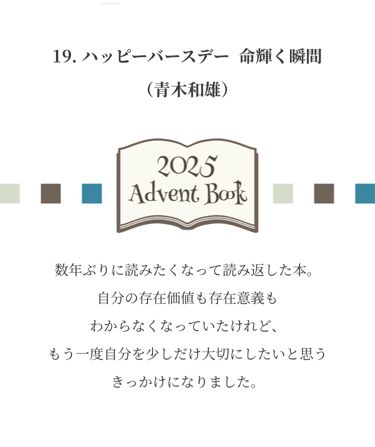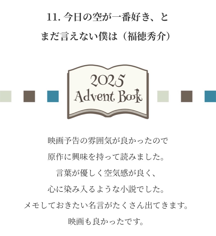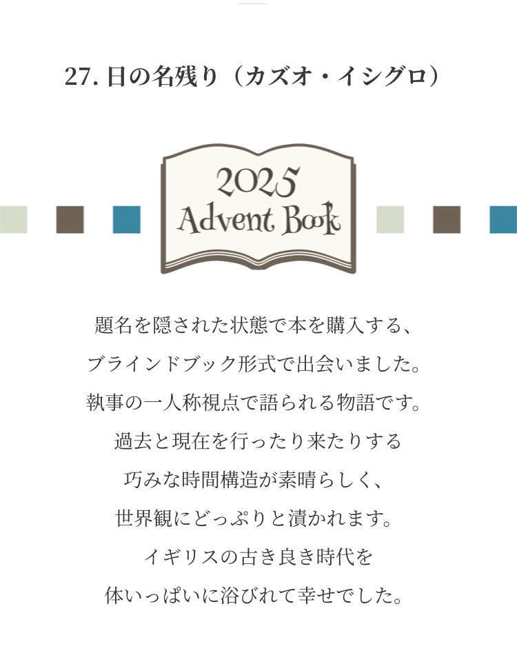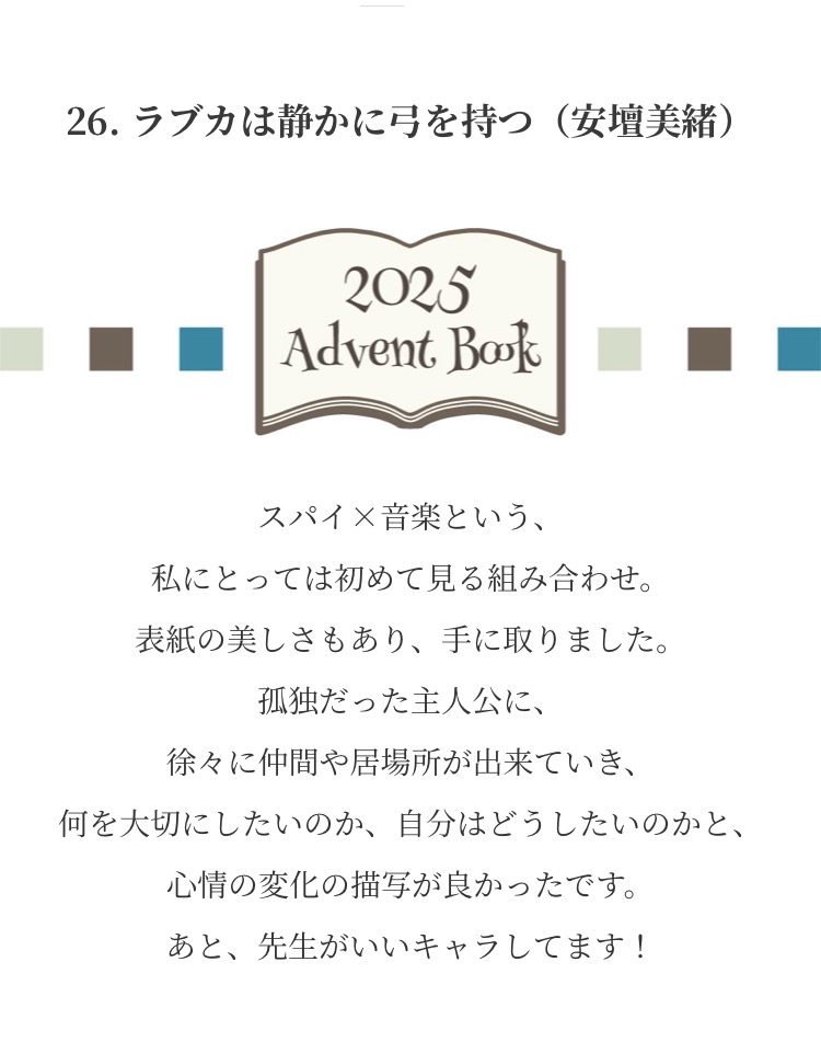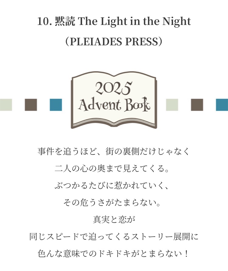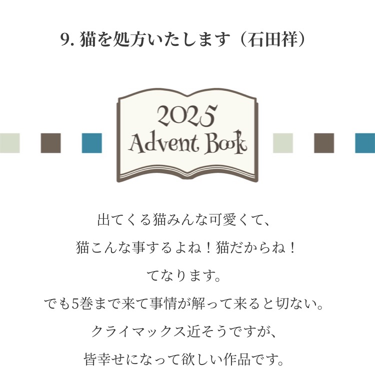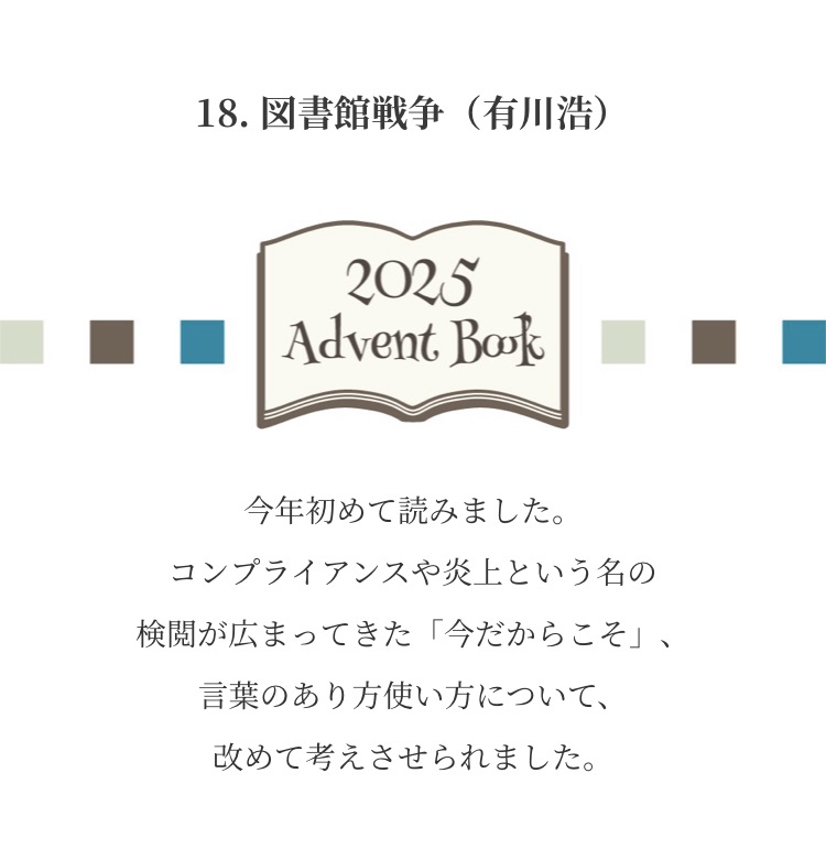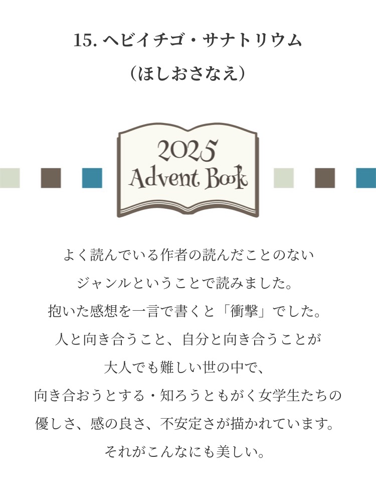 Advent Books 20252025年12月1日 みなさまからお寄せいただいた『私が選ぶ 今年の1冊』新年までのアドベントカレンダー方式で毎日1冊ずつご紹介させていただきました こちらから全作品がご覧になれます ↓ タップ or クリック ↓ これが気になります!